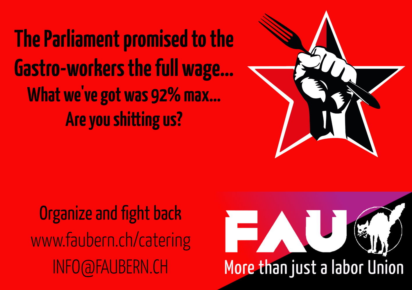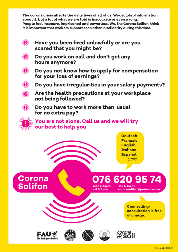 A cooperation of FAU Bern, Gastrakollektiv, IWW JAM and Solnet now also offers telephone advice in connection with the current crisis. With this means we try to actively intervene in the debate. You can find more information about this under: