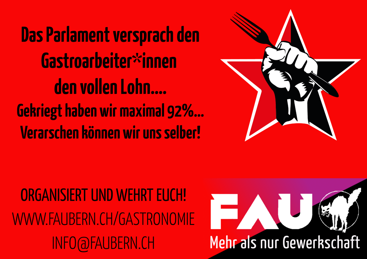 Willkommen auf der Seite des Gastro-Syndikats! Hier findest du nicht nur Artikel zur Gastronomie-Branche, sondern auch eine Zusammenfassung zum Landesgesamtarbeitsvertrags L-GAV in der Gastronomie und eine Umfrage zu den Arbeitsbedingungen.