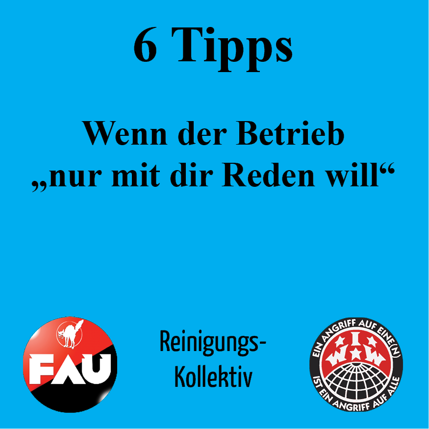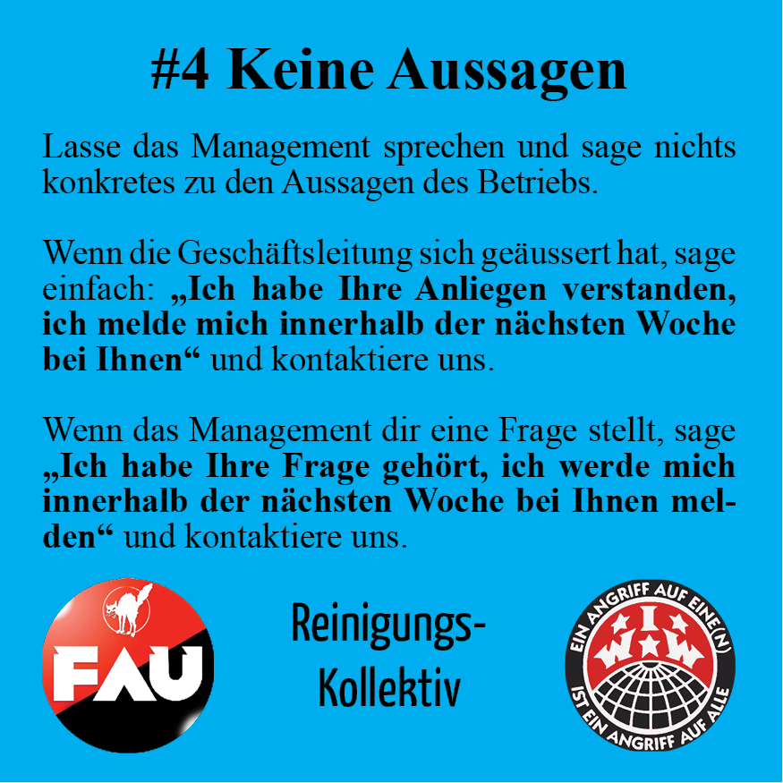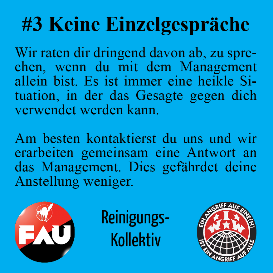 Heute hat die Reinigungsfirma Enzler zu einem weiteren Mittel des (Grassroots) Union Busting gegriffen: Sie hat die Sozial"Partner*in" Unia eingeladen und die Teilnahme an der Veranstaltung zur Pflicht erklärt. Die seit Beginn des Arbeitskonfliktes abwesende Unia einzuladen, soll den Konflikt weg von den kämpfenden Basisgewerkschaften drängen. Doch Arbeiter*innen von Enzler hatten bereits vor der Unia eine Resolution verabschiedet, in der sie der FAU, IWW und dem Reinigungskollektiv ihr Vertrauten aussprechen.